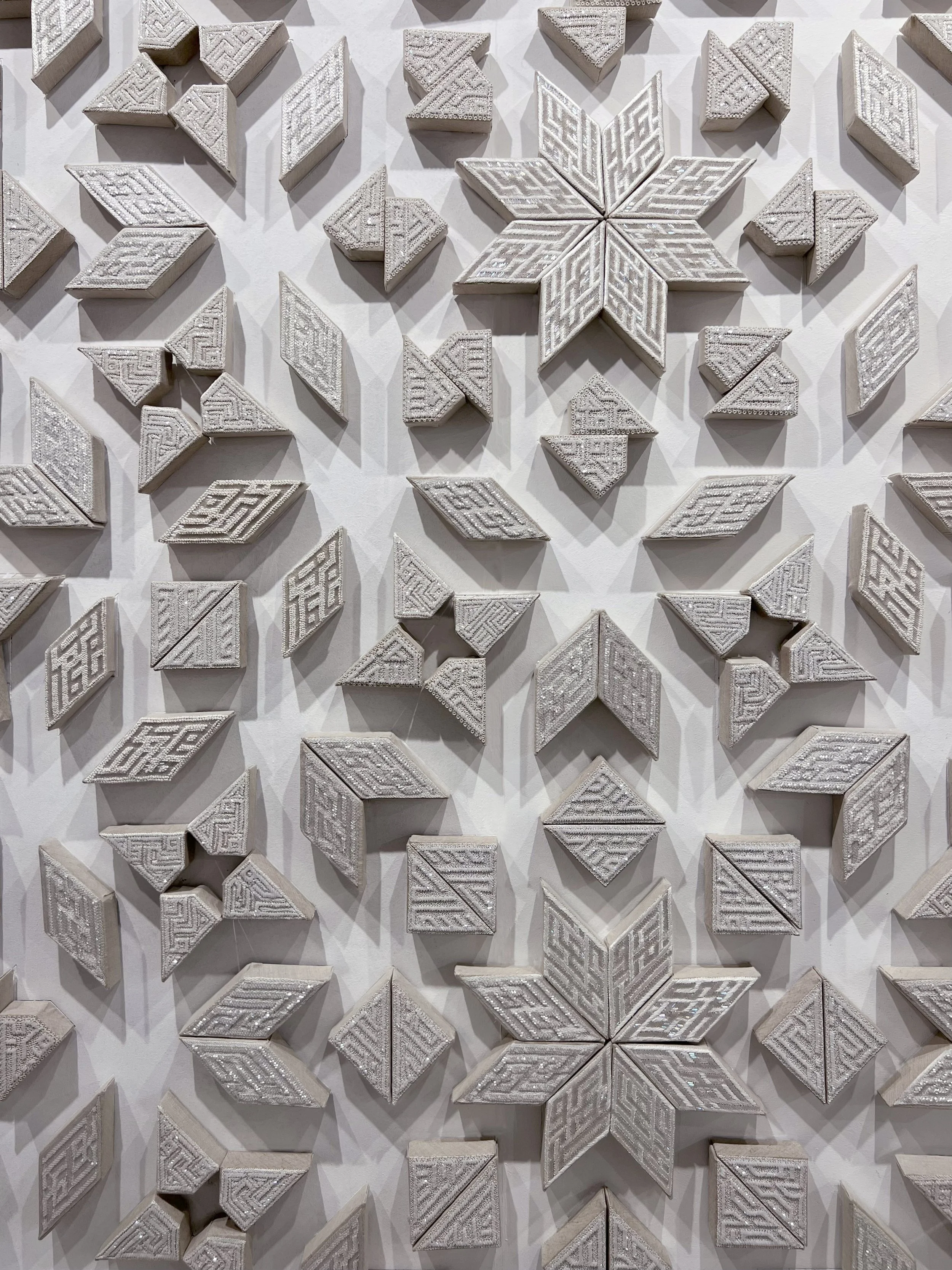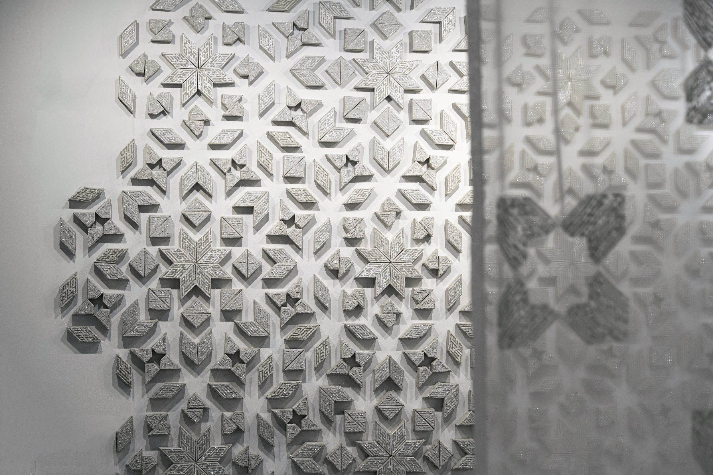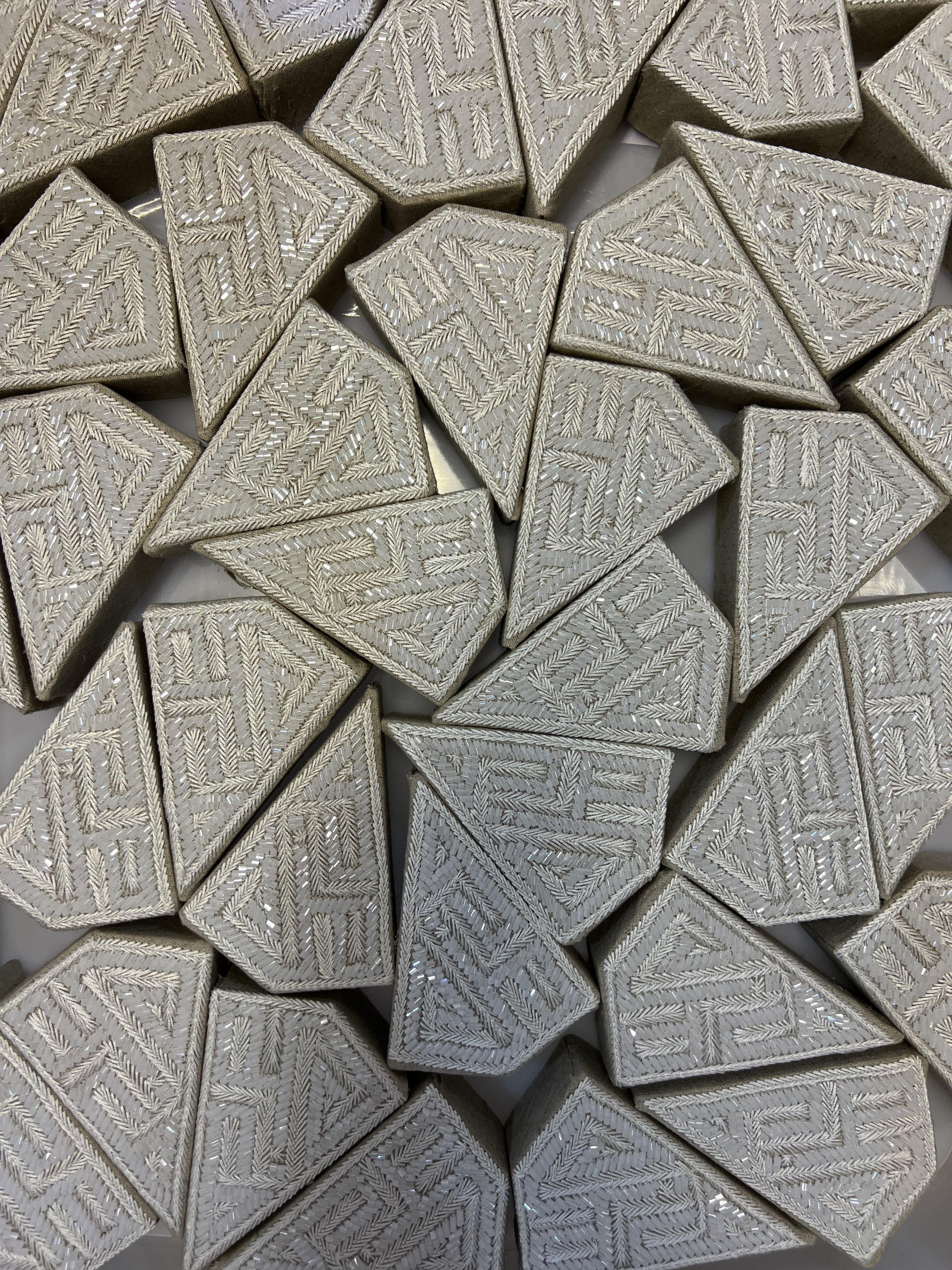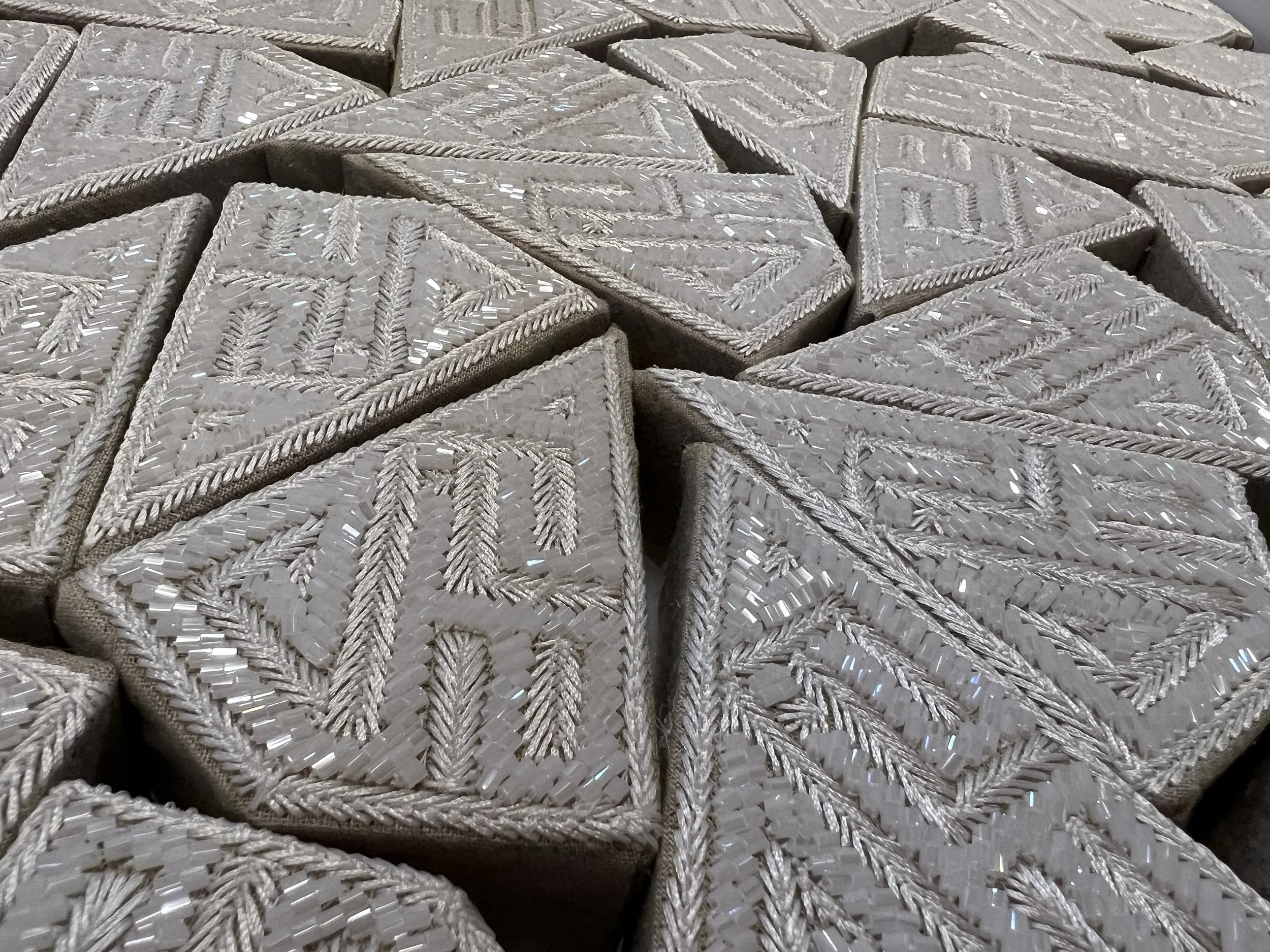 The words of the prayer are hand-embroidered and beaded onto over 800 pieces to make up the kaleidoscopic installation.