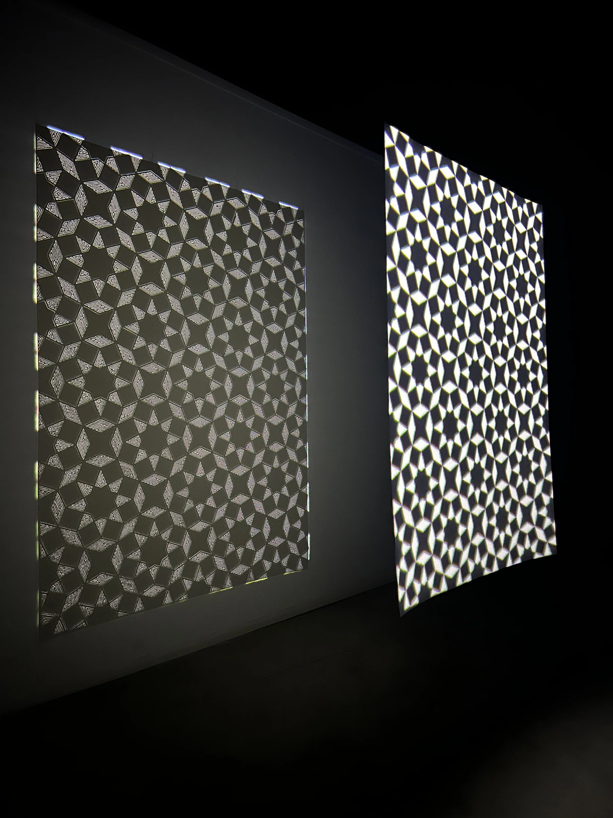 ‘Light Within the Heart’ is an immersive installation featuring a poem of the same title by the 12th century Persian scholar Shihab al-din Suhrawardi, known as the founder of ther philosophical school of illuminationism. Created with an intricate geometric design, the words of the poem come to life as light shines through the hand-pierced paper through projection mapping. The light installation showcases the sacred geometry onto the paper, which reflects the delicately pinpricked square Kufic calligraphy onto the adjacent wall. As the words appear, a recitation of the poem by Saudi singer/songwriter simultaneously plays in the darkened room, creating an evocative immersive experience.